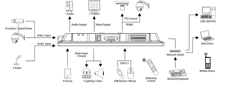 - Alarm triggering screen tips, buzzer, PTZ, e-mail, FTP upload