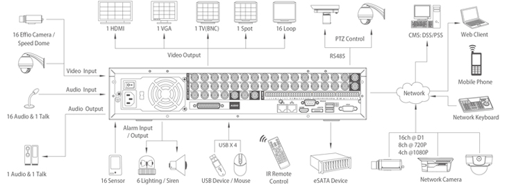 - IP: 16 channel @D1, 8 channel @720P, 4 channel @1080P realtime recording