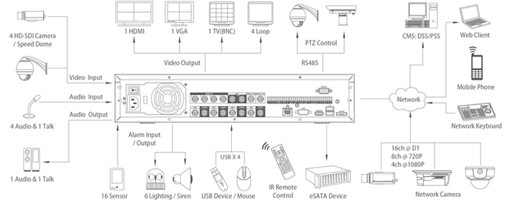 - IP: 16 channel @D1, 8 channel @720P, 4 channel @1080P realtime recording